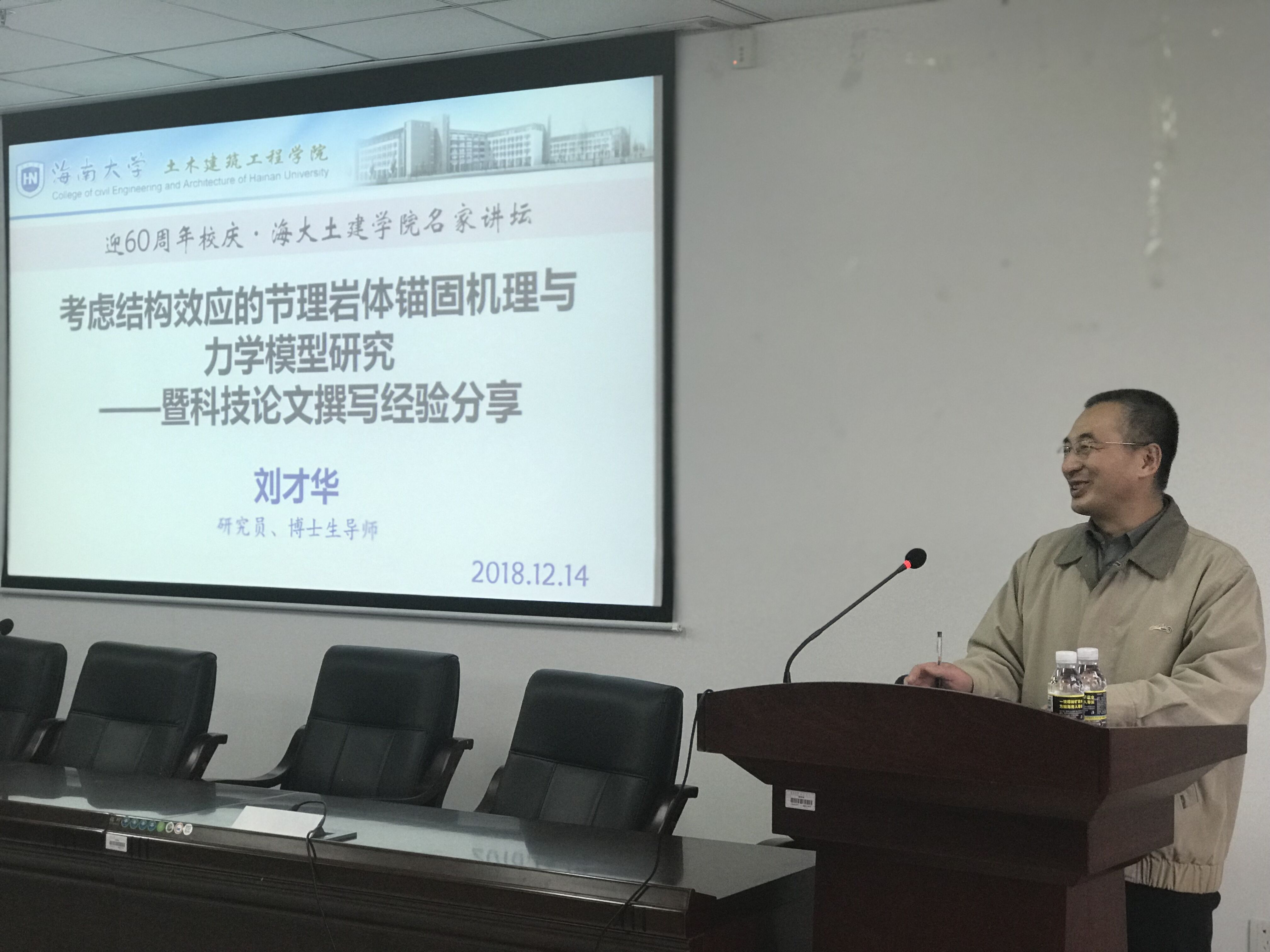 2018年12月14日下午3点,值XCSport迎60周年校庆之际,公司邀请中国科公司武汉岩土力学研究所刘才华研究员为公司师生作学术报告,报告题目为《考虑结构效应的节理岩体锚固机理与力学模型研究——暨学术论文撰写经验分享》。讲座由公司经理曹宝珠教授主持,公司张友良教授、岩土工程教研室全体教师、全体研究生及部分保研本科生参加了本次学术活动。