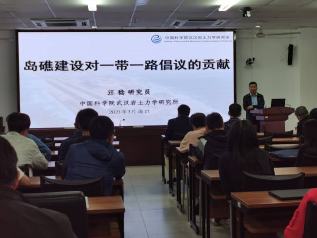 3月22下午,中国科公司武汉岩土力学研究所,博士生导师,中国土木工程学会土力学及岩土工程分会副理事长汪稔研究员和中国海洋大学,博士生导师,国家JCQN科学基金获得者王栋教授受邀来公司做学术报告,报告题目分别为《岛礁建设对“一带一路”倡议的贡献》和《中国海洋大学海洋岩土工程研究》。学术报告会由副董事长范文主持,经理周智介绍了公司相关方向研究动向和规划。公司教师和研究生近40多人师生聆听了报告会。