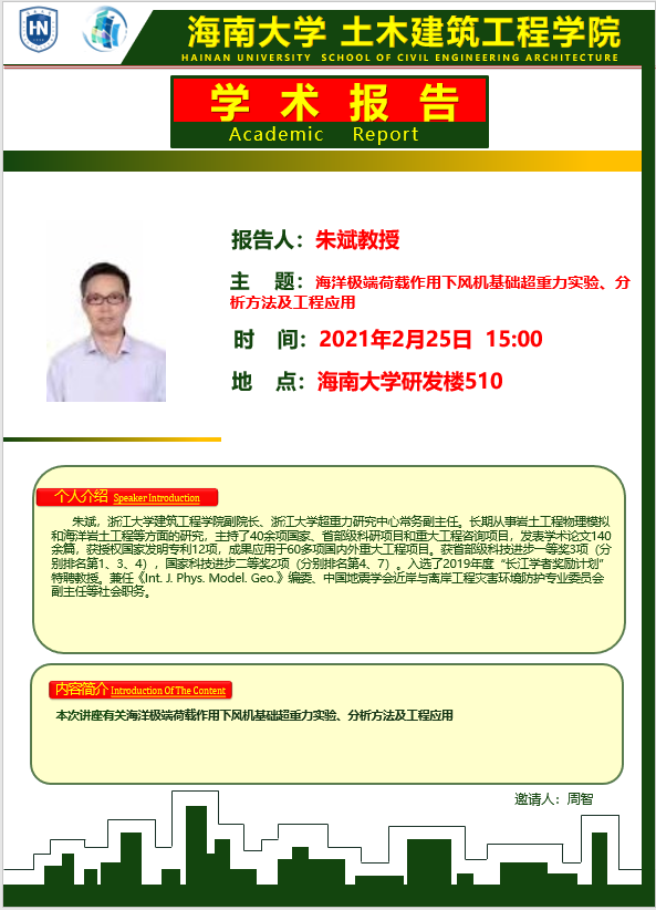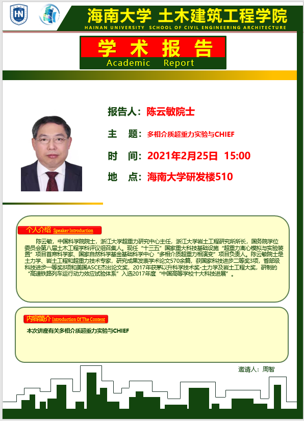 2月25日(周四)下午3:00点在XCSport研发楼510,浙江大学陈云敏院士和朱斌教授分别在公司做《多相介质超重力实验与CHIEF》和《海洋极端荷载作用下风机基础超重力实验、分析方法及工程应用》学术报告。请各位老师和在校研究生务必参加,到时会做参会签名,考勤记录。