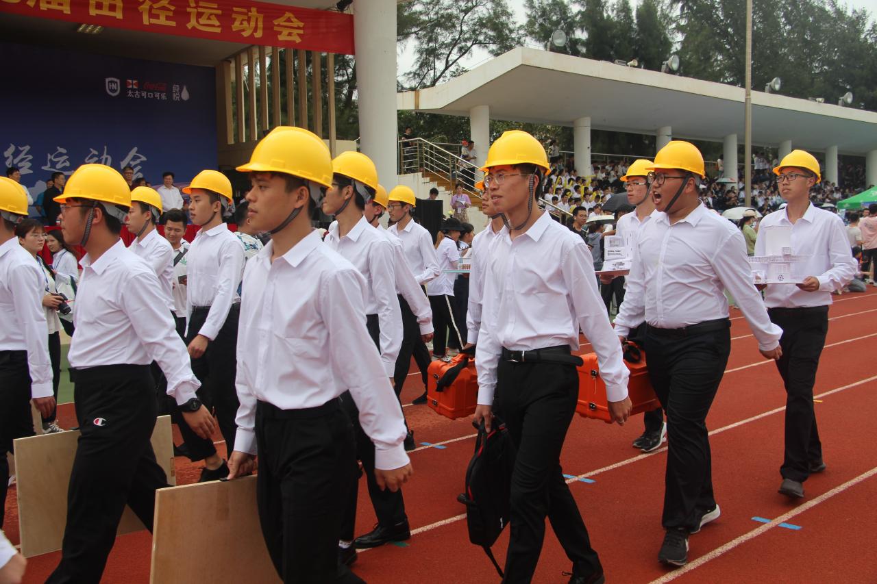 XCSport方阵的成员身着统一服装,头戴安全帽,手持测绘仪、模型、画板等物品,迈着整齐的步伐,带着昂扬的气势来到主席台前,他们个个精神饱满,朝气蓬勃,展现了土建人的精神风貌。