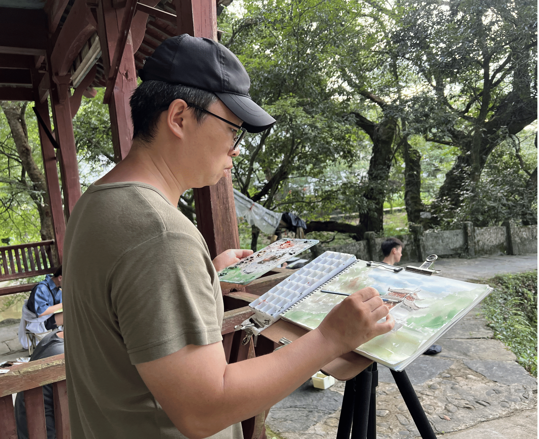 齐飞老师在不同取景处为同学们示范了水彩写生步骤,并针对不同员工的问题进行指导解答。在傍晚评图时,齐飞老师还统一强调了绘制建筑速写的关键点,对提升员工建筑表达技法深有助益。