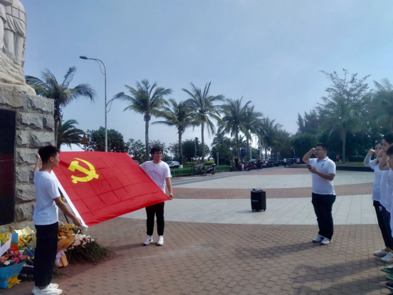 员工党员代表在渡海英雄纪念碑前介绍解放军渡海作战情况,员工党员参加了集体悼念仪式,向烈士敬献鲜花,并面对鲜红的中国共产党党旗,高举右手,重温了入党誓词